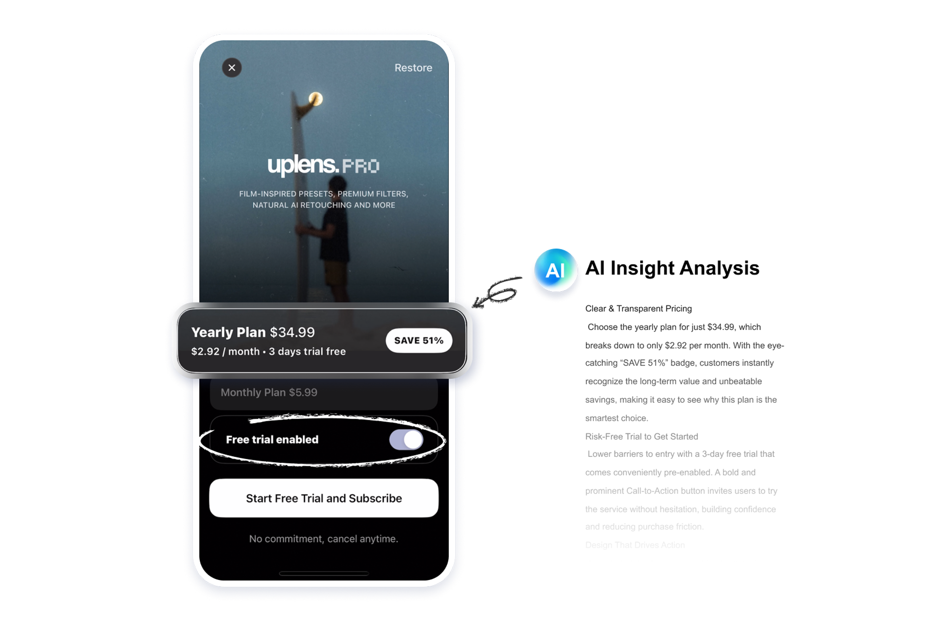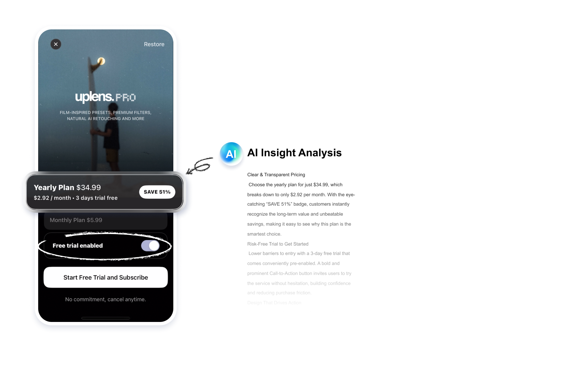 Gain AI-driven insights on pricing, UI, and trial strategies